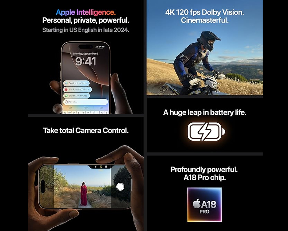 The Apple iPhone 16 Pro Max is a high-end smartphone announced in September 2024. It features a 6.9-inch Super Retina XDR OLED display with a 120Hz refresh rate and Ceramic Shield glass for durability. Powered by the Apple A18 Pro chipset with 8GB of RAM, it offers top-tier performance and storage options up to 1TB. The camera system includes a 48MP main sensor, a 48MP ultrawide, and a 12MP 5x telephoto lens, supporting advanced video recording like 4K at 120fps. It has a 4685mAh battery with fast charging (45W wired, 25W MagSafe wireless), promising the best battery life ever in an iPhone. Additional highlights include a titanium build, new Camera Control button, and iOS 18, upgradeable to 18.3.2, with Apple Intelligence features. It starts at a premium price, reflecting its cutting-edge specs and design refinements like thinner bezels.